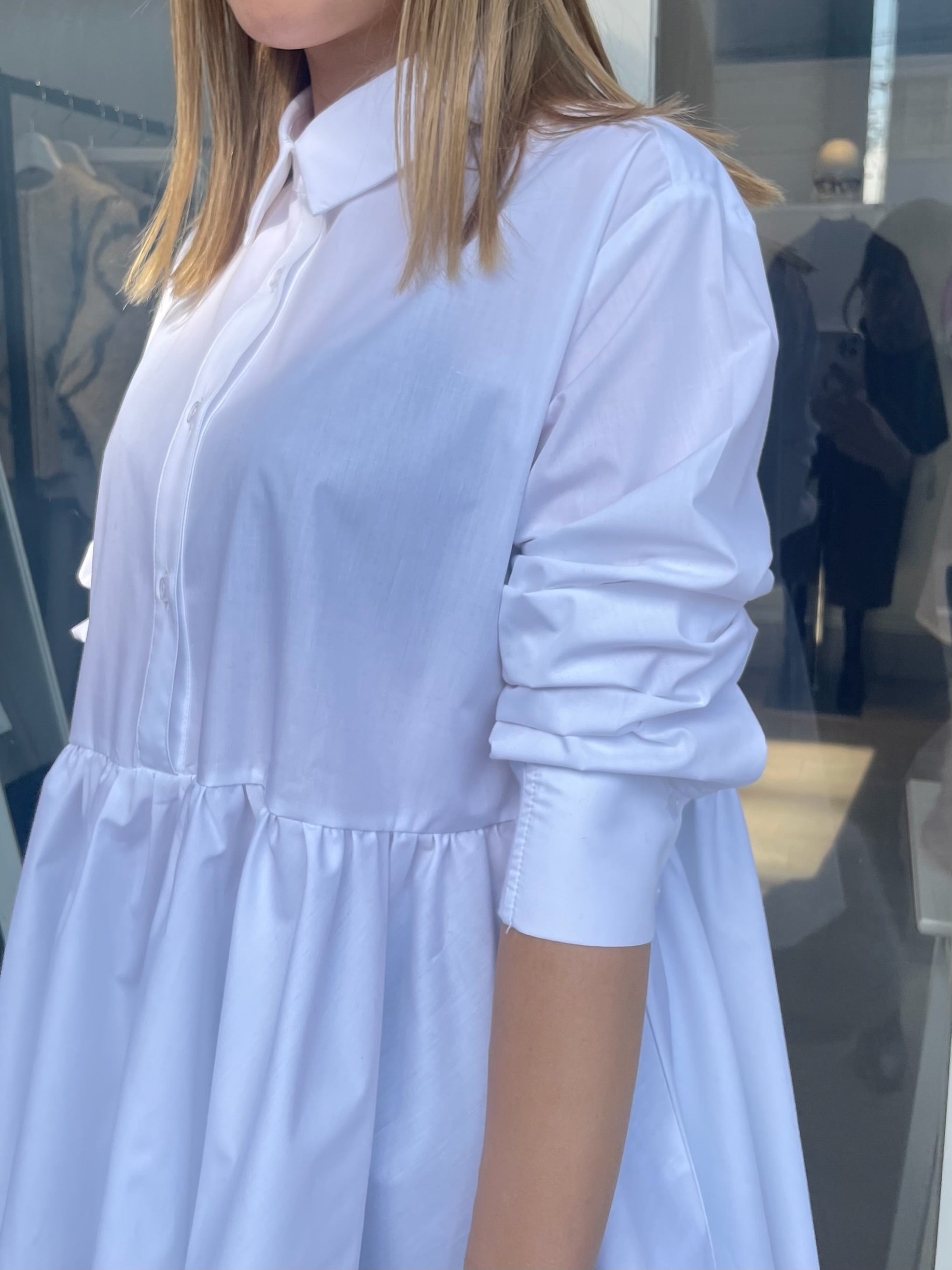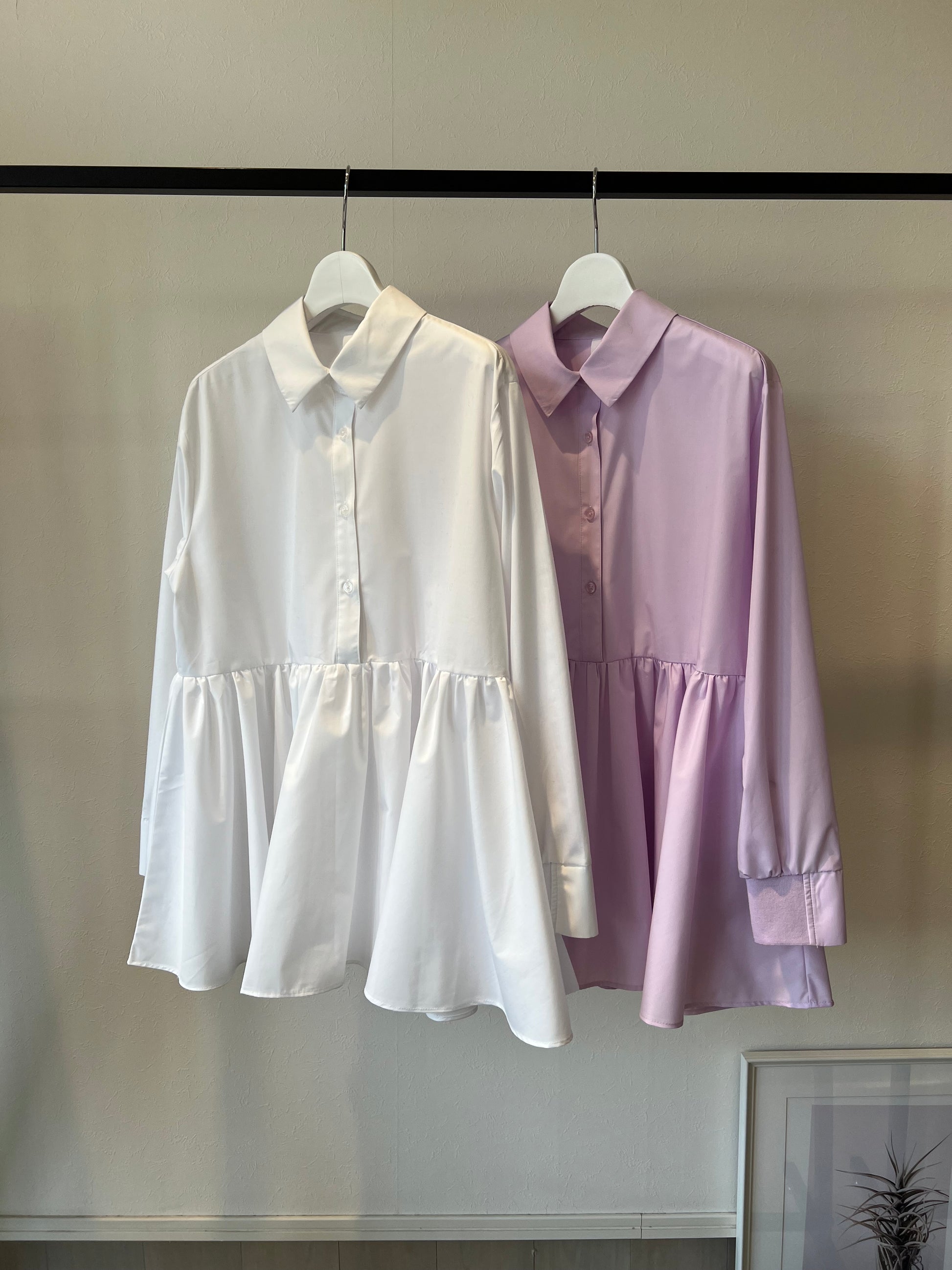 胸下切り替え位置にたっぷりと寄せたギャザーから広がるフレアシルエット。