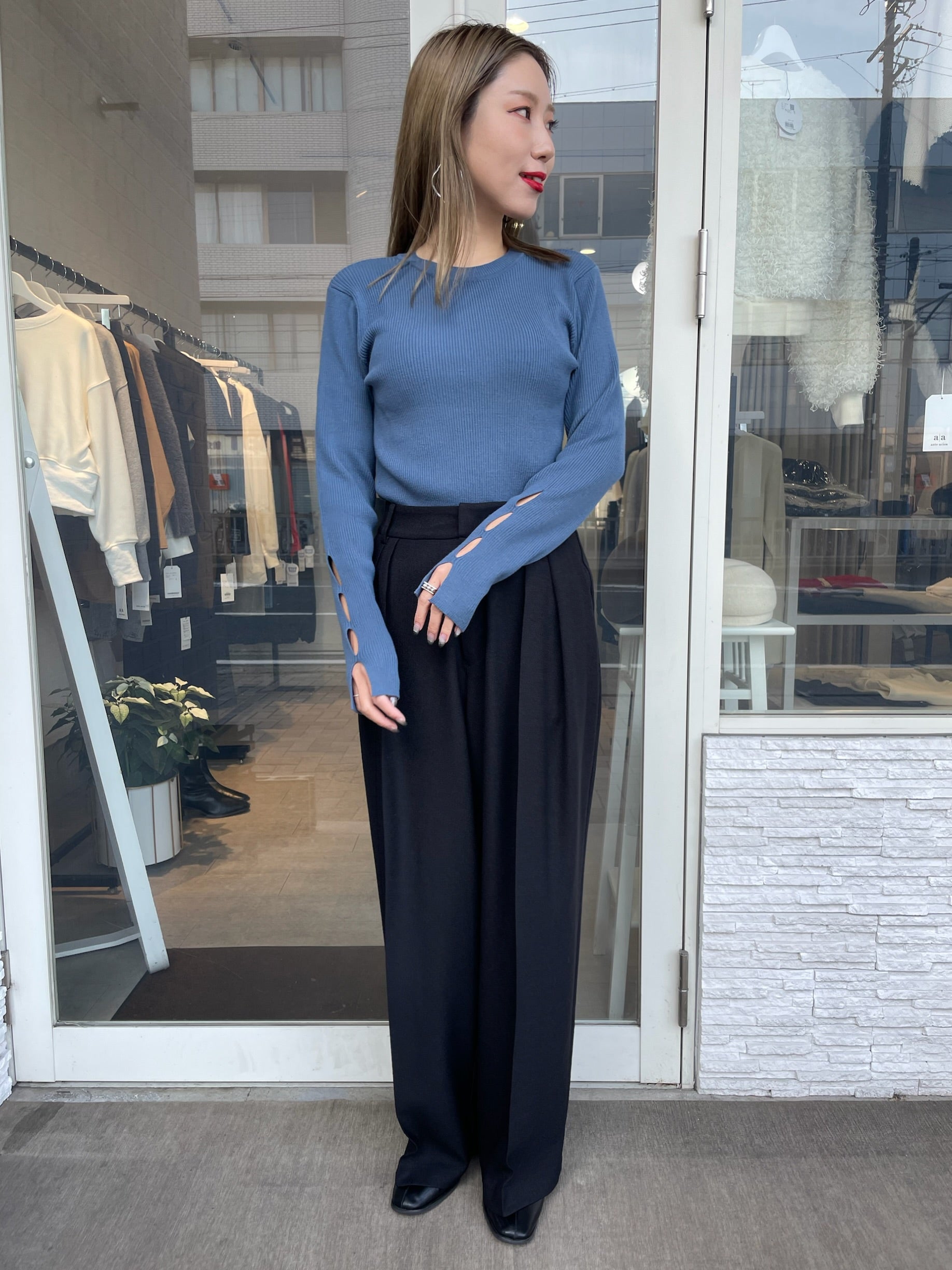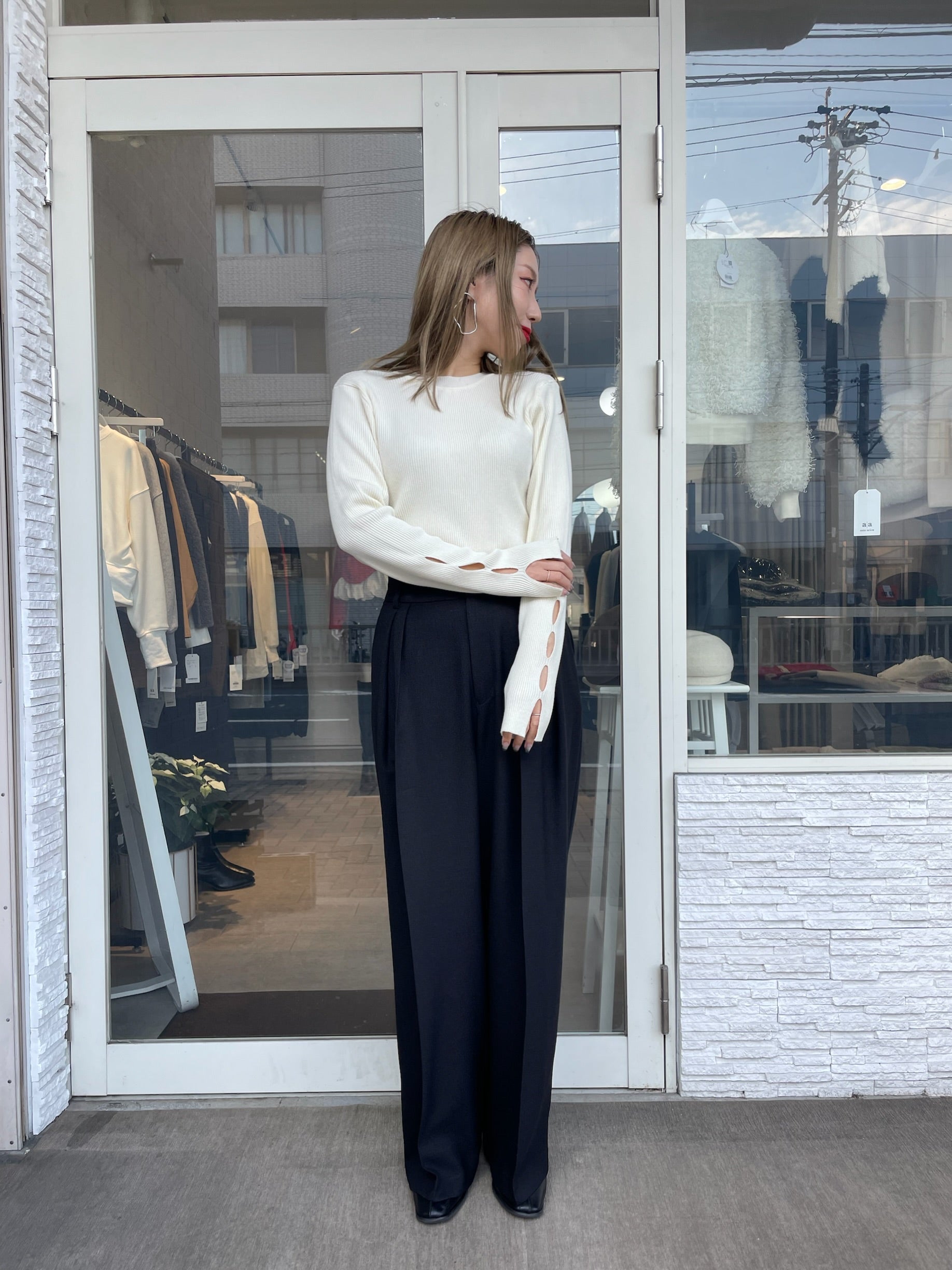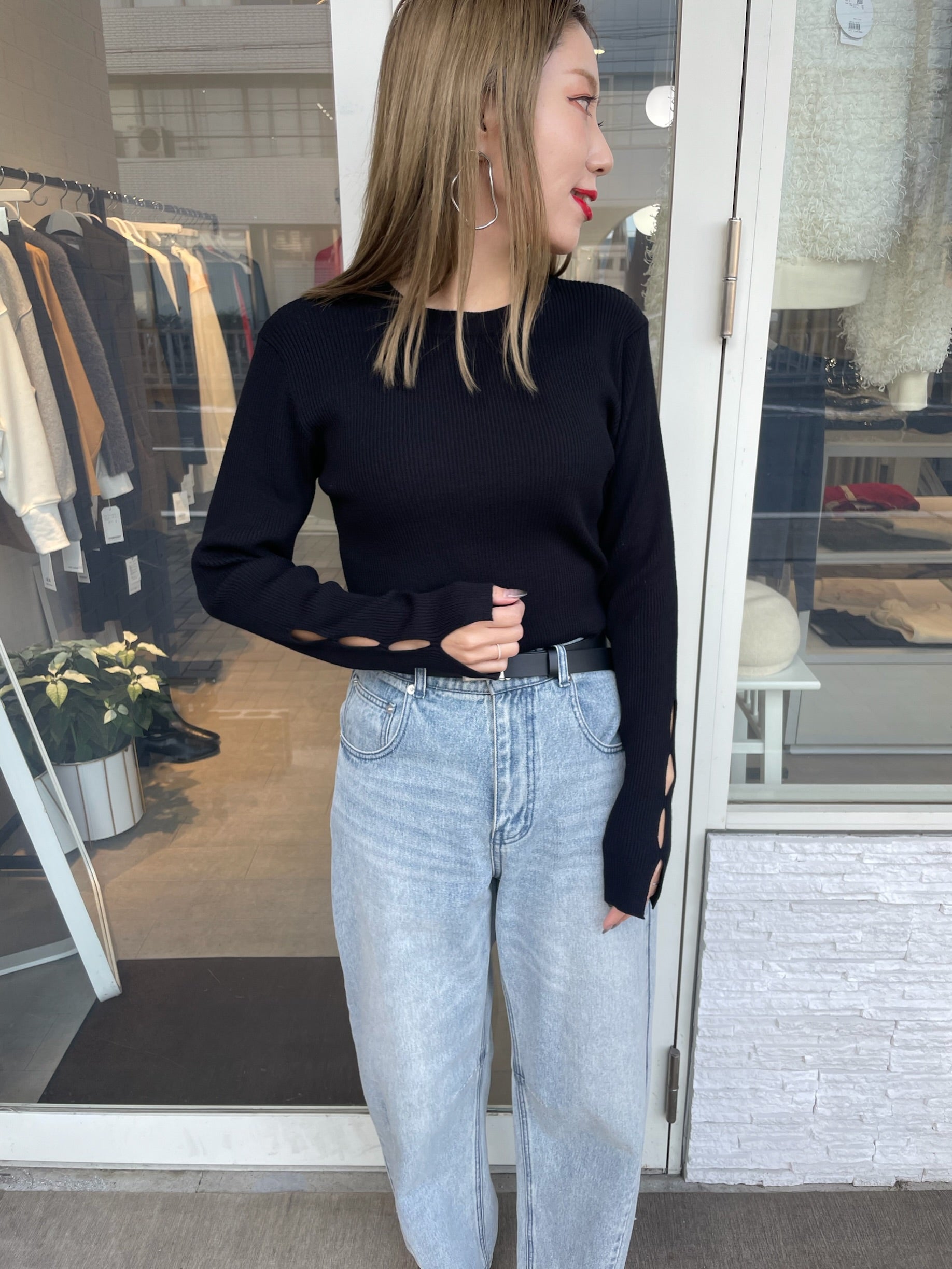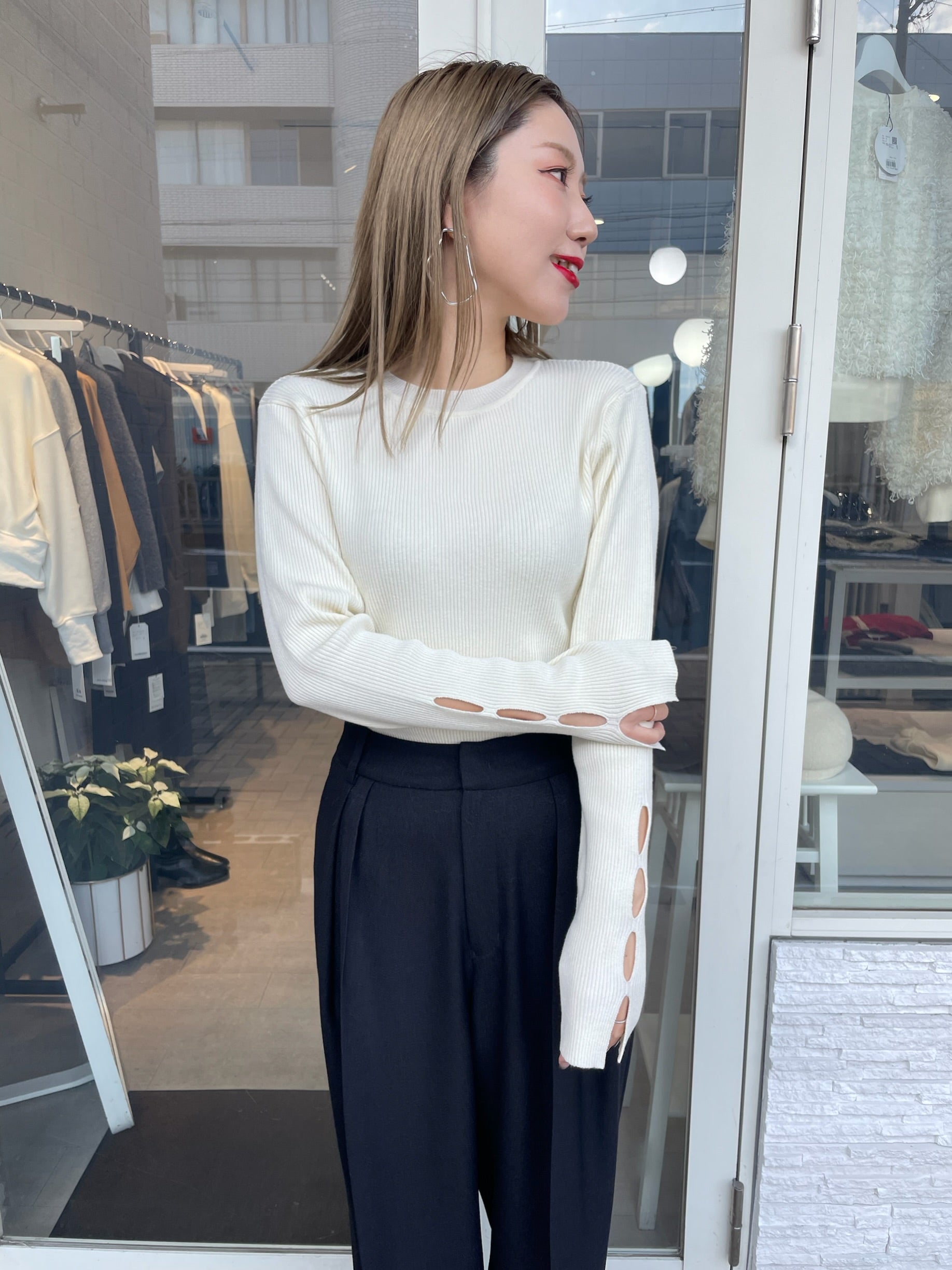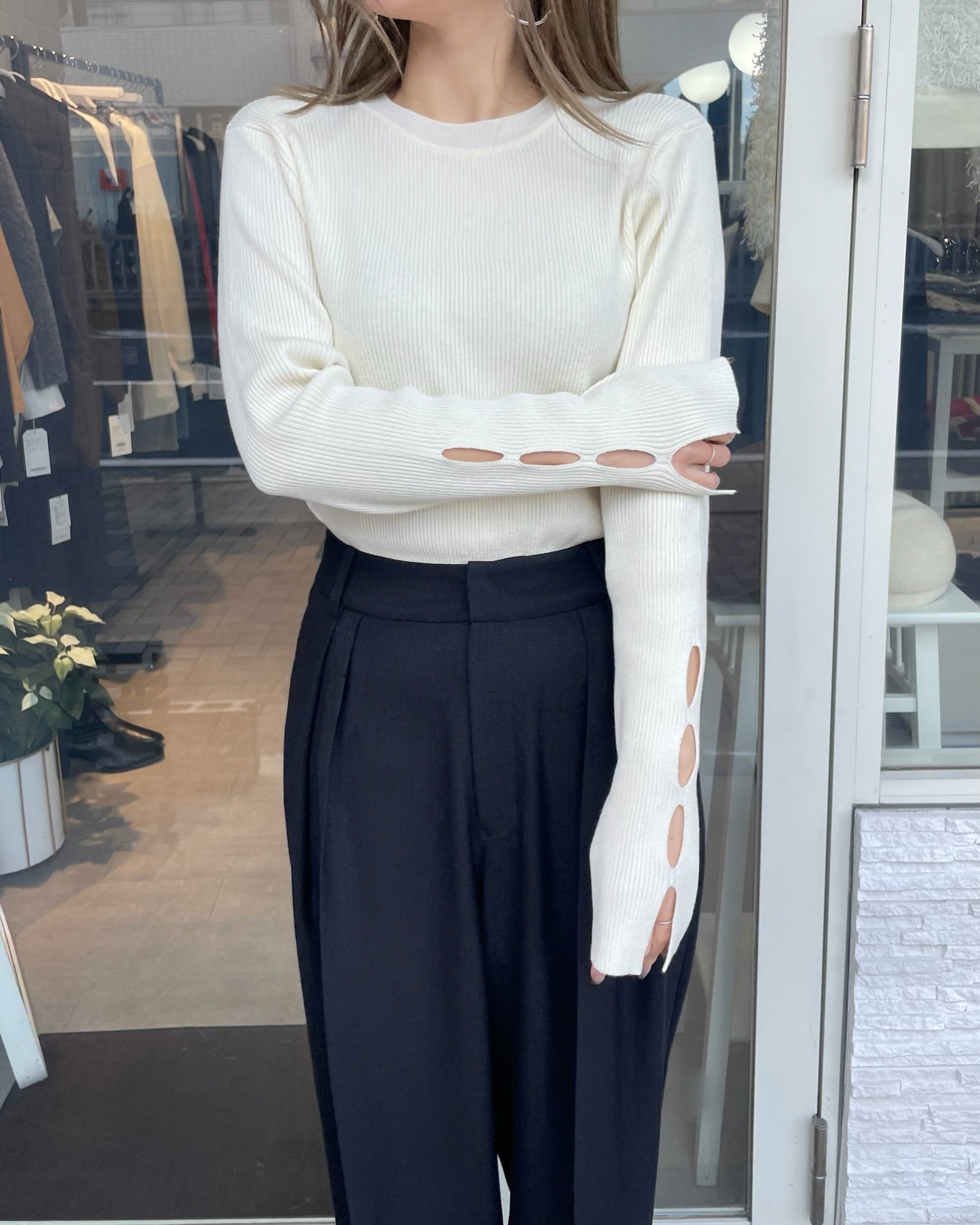 手元にさりげない抜け感をプラスする、袖口カットデザインのリブニット。