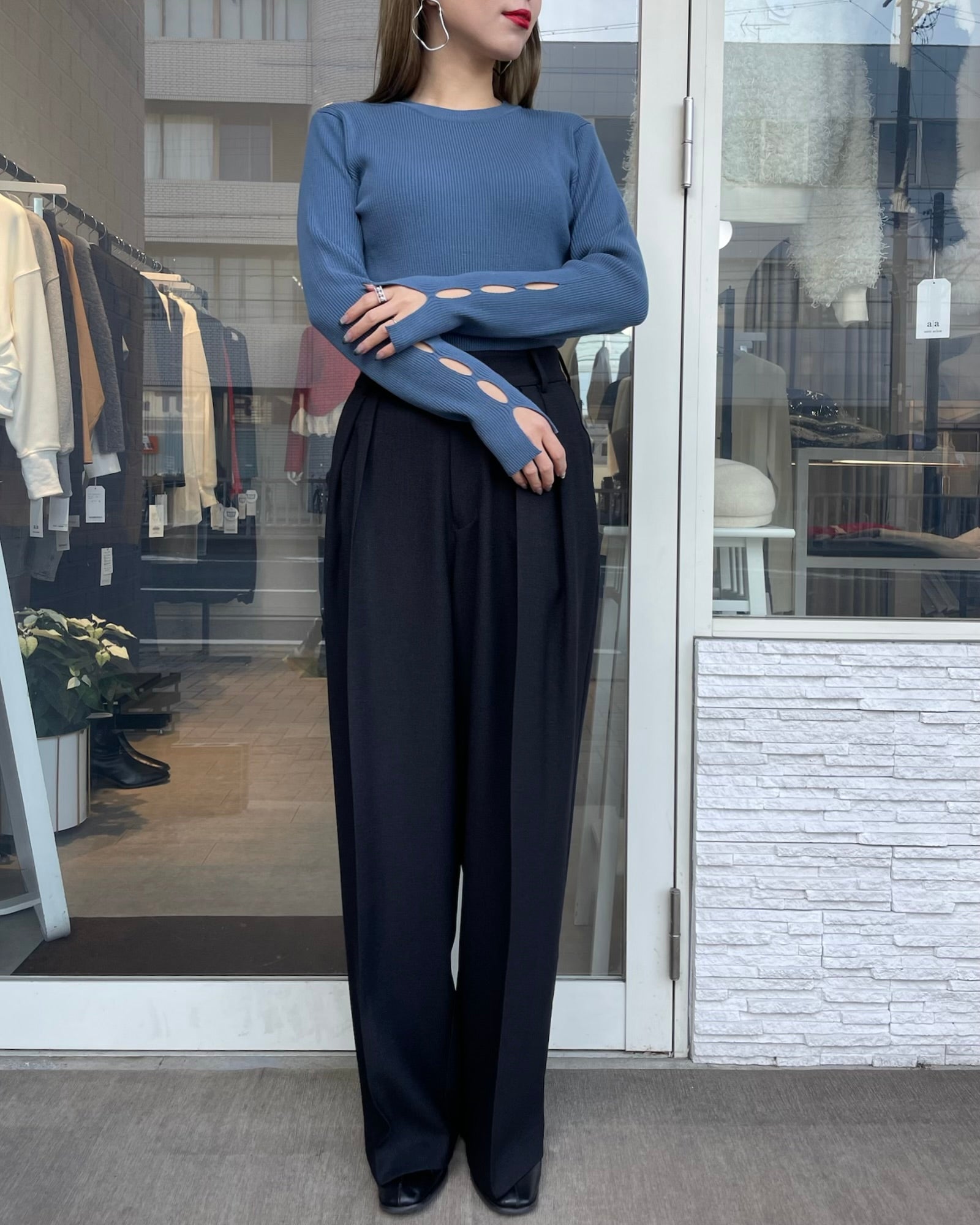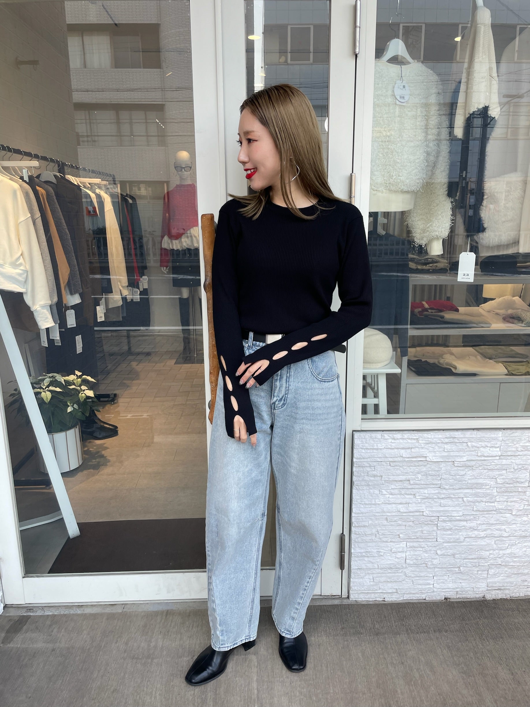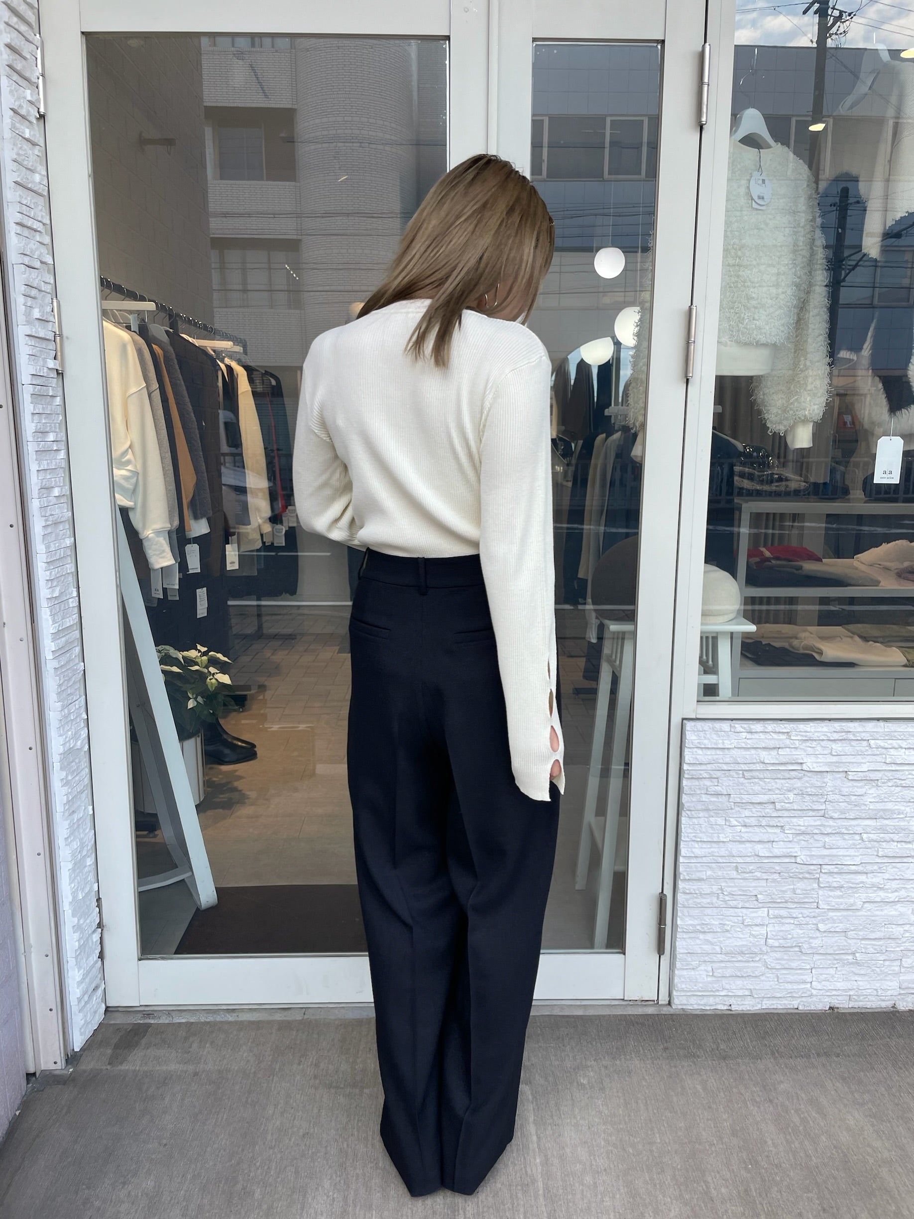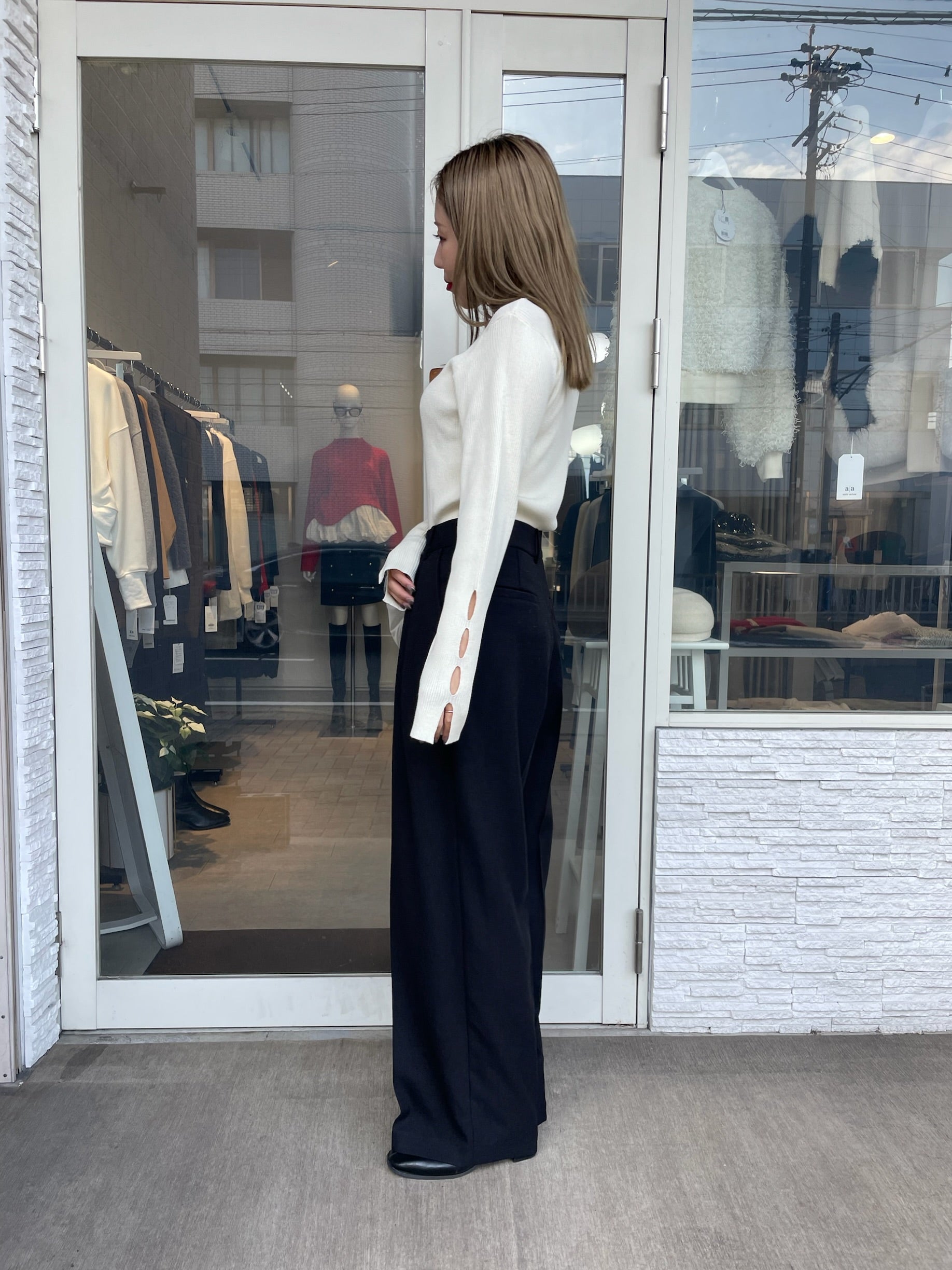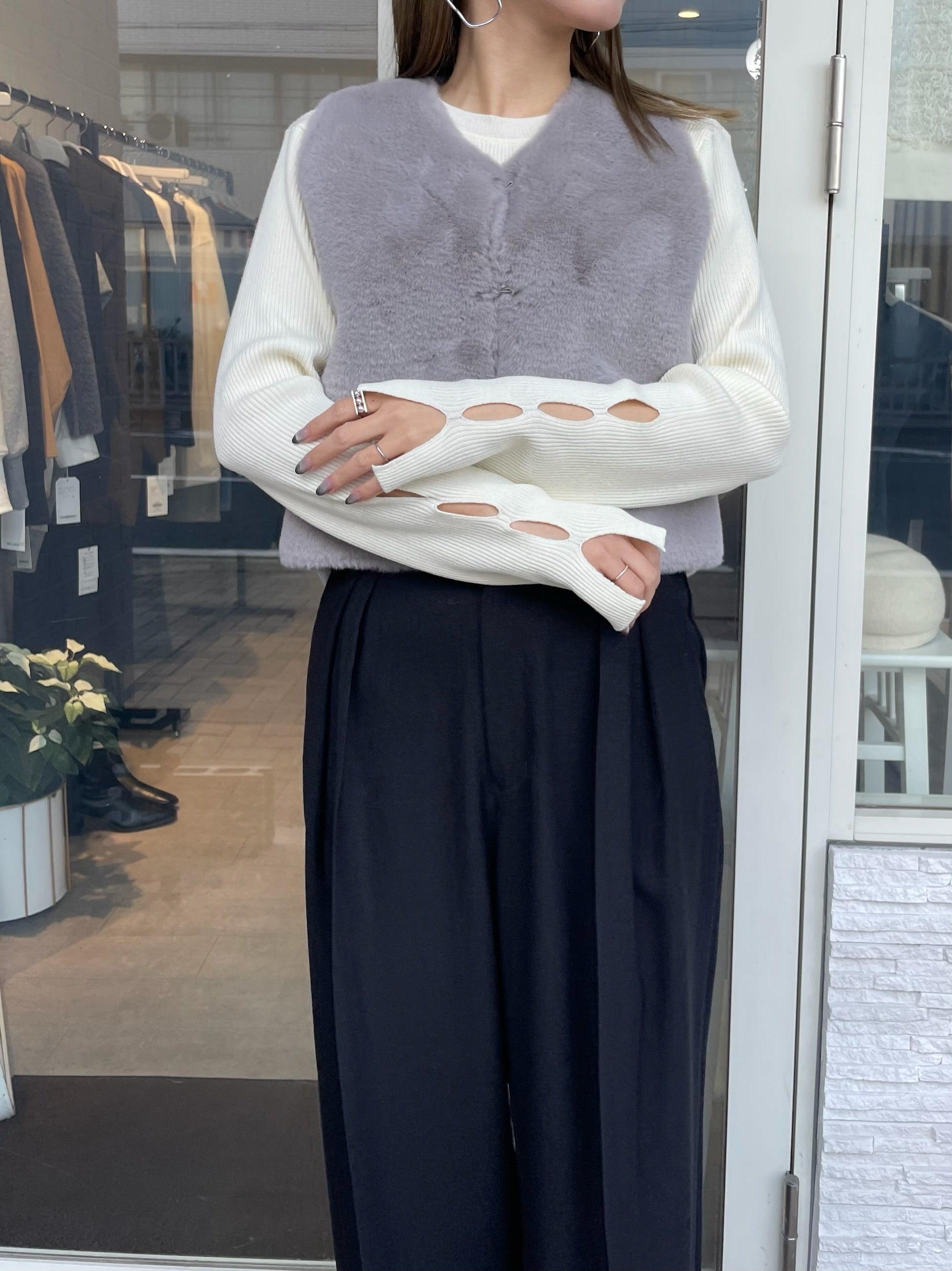 手元にさりげない抜け感をプラスする、袖口カットデザインのリブニット。