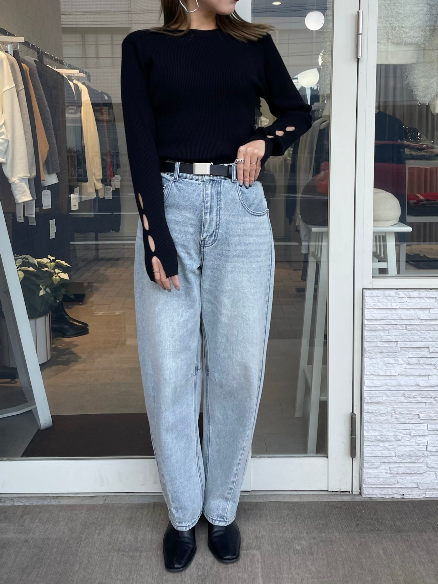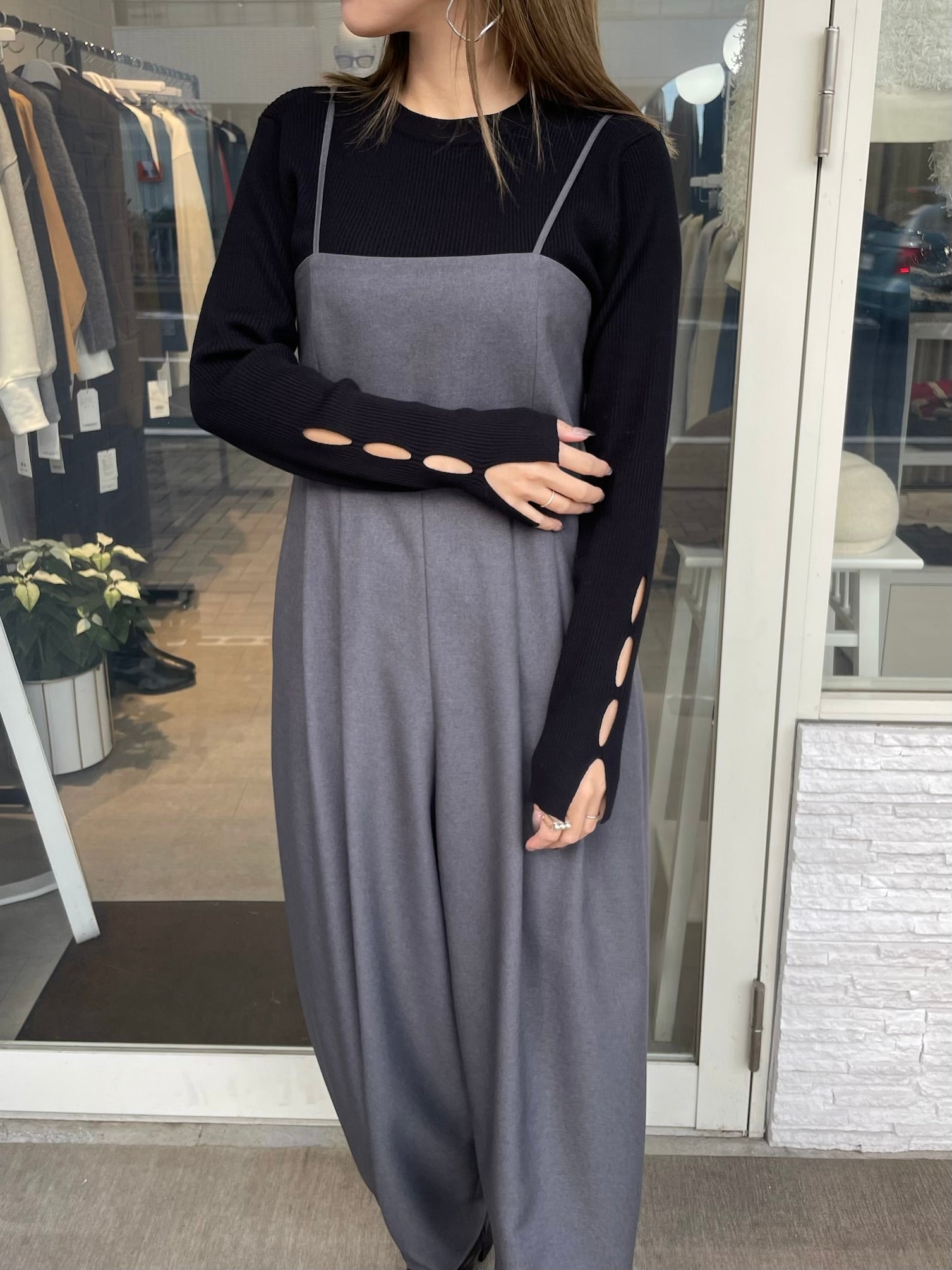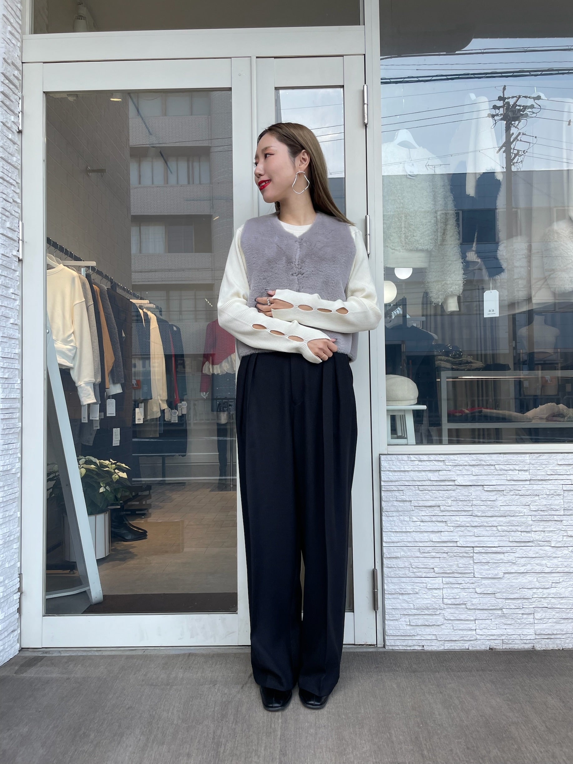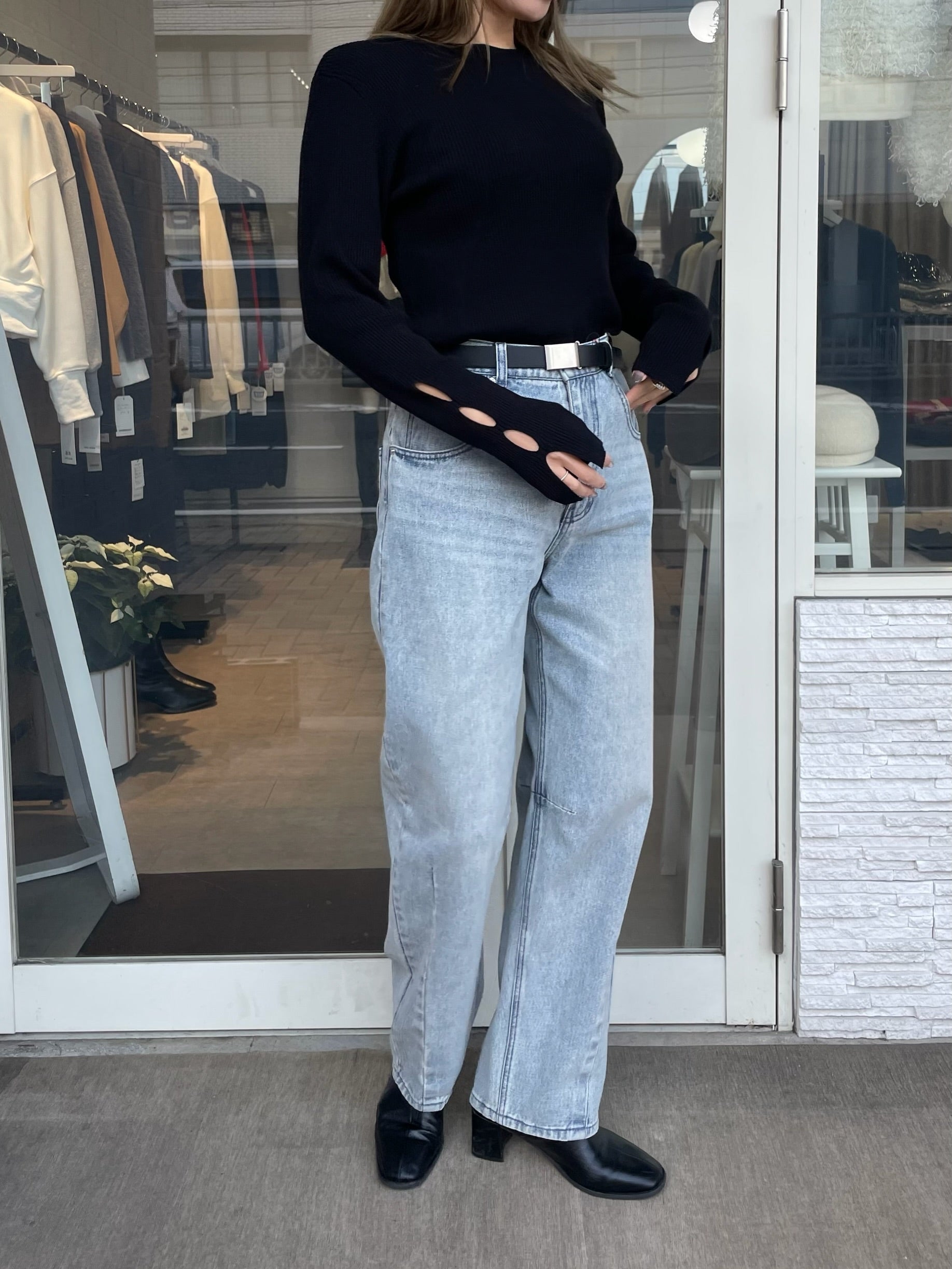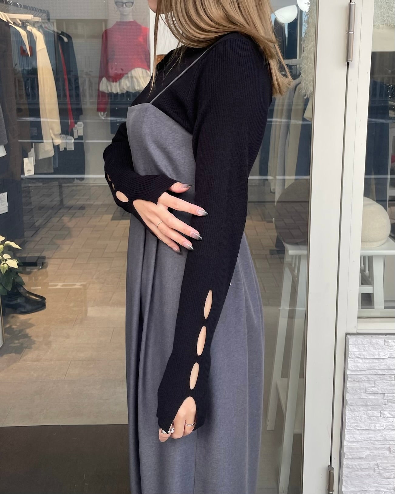 手元にさりげない抜け感をプラスする、袖口カットデザインのリブニット。