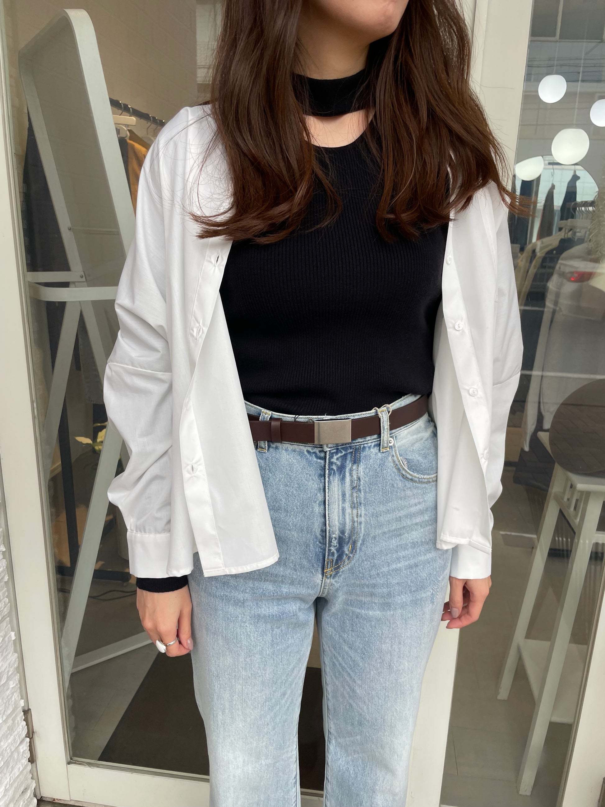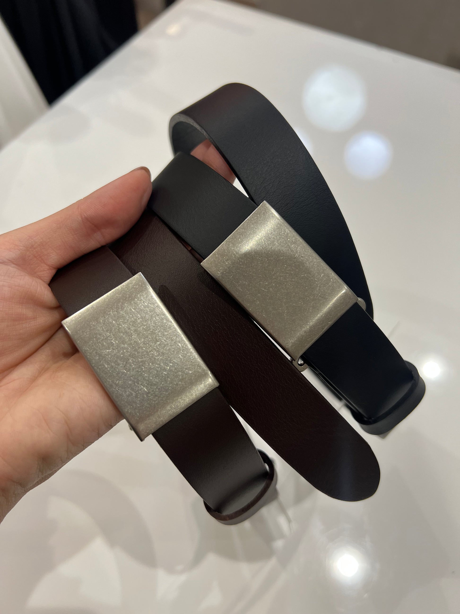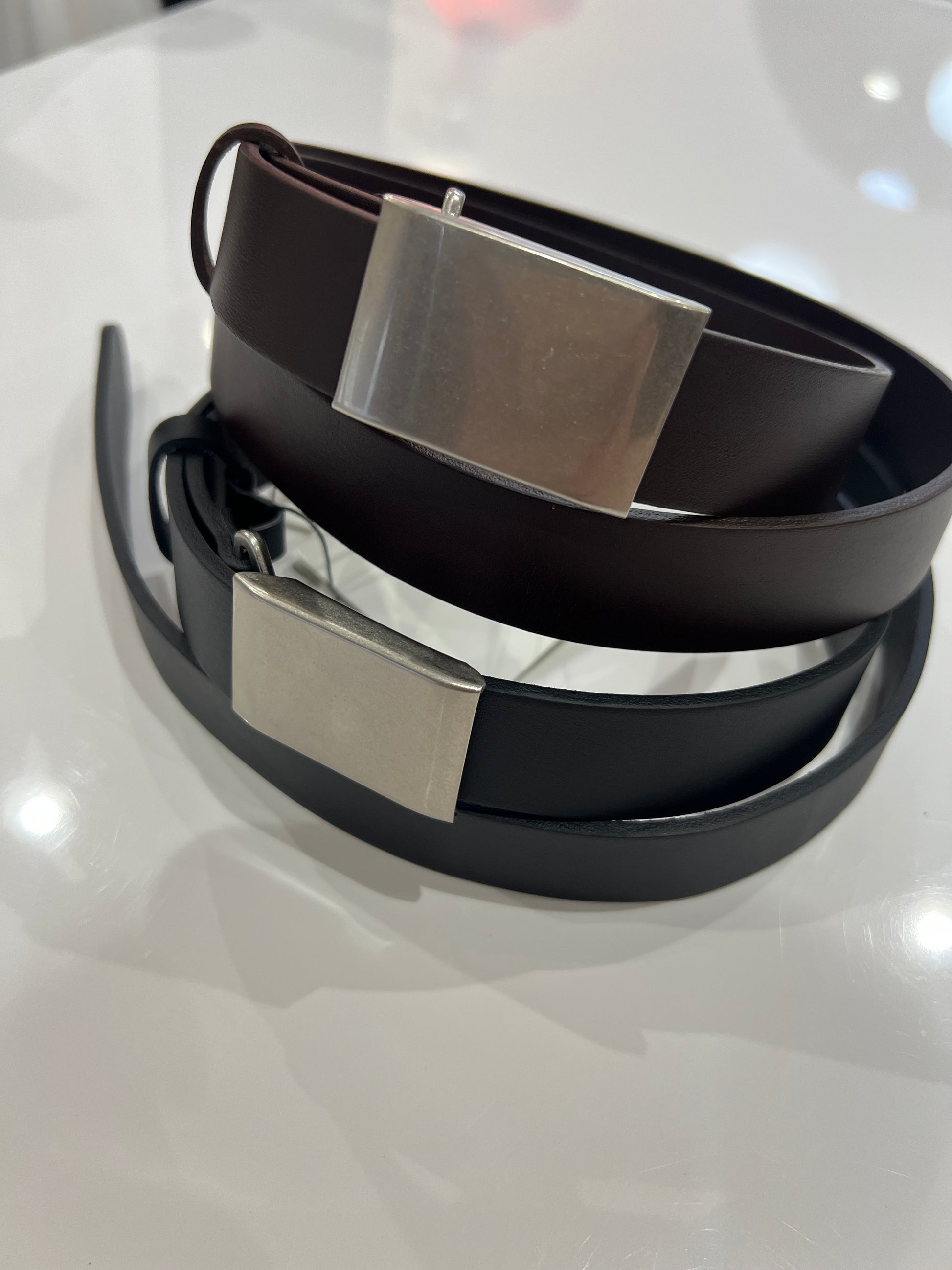 ほどよい厚みのあるレザーとスクエアバックルで、シンプルながらも存在感があり