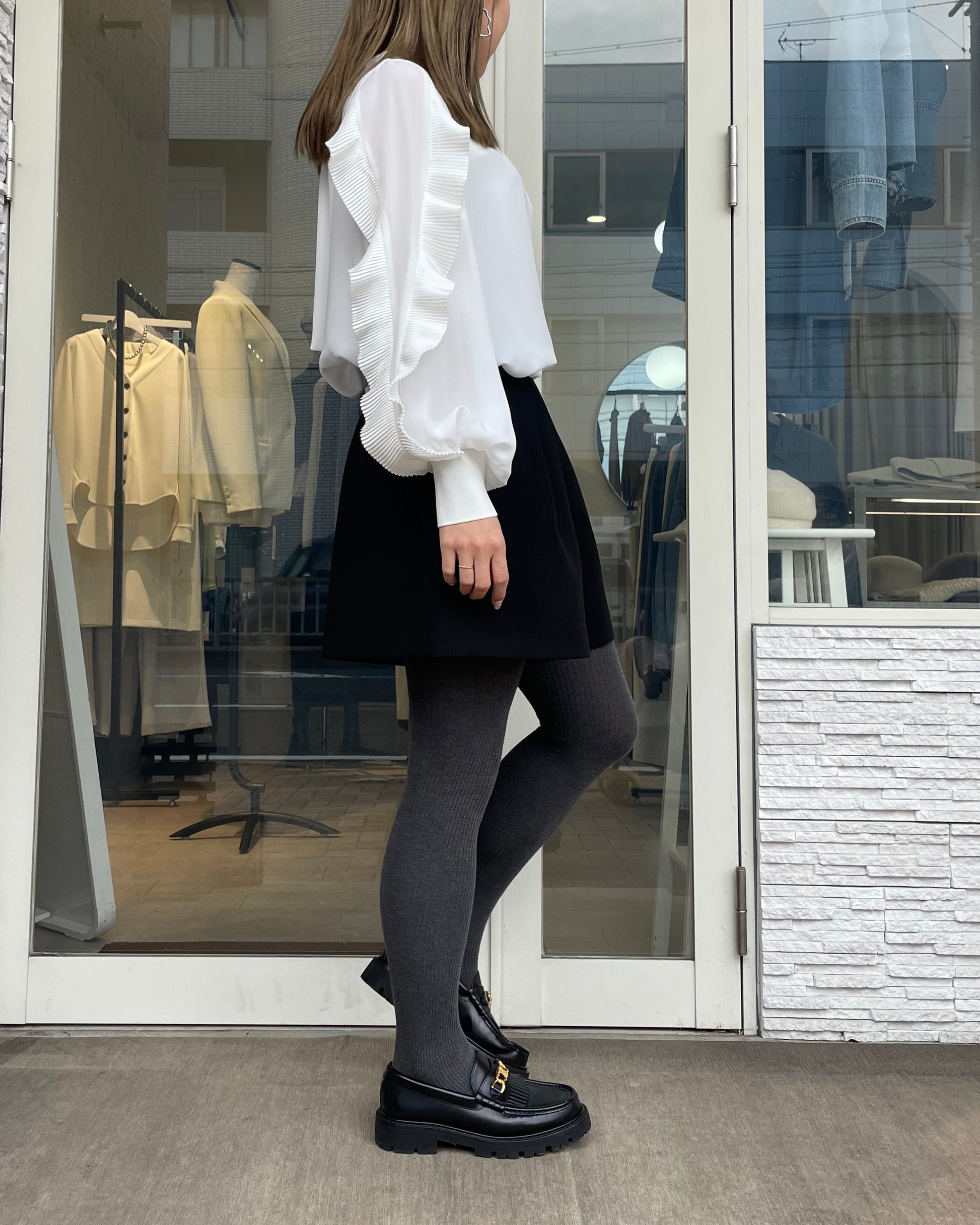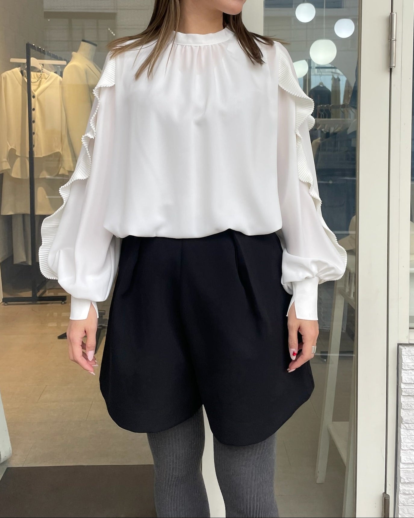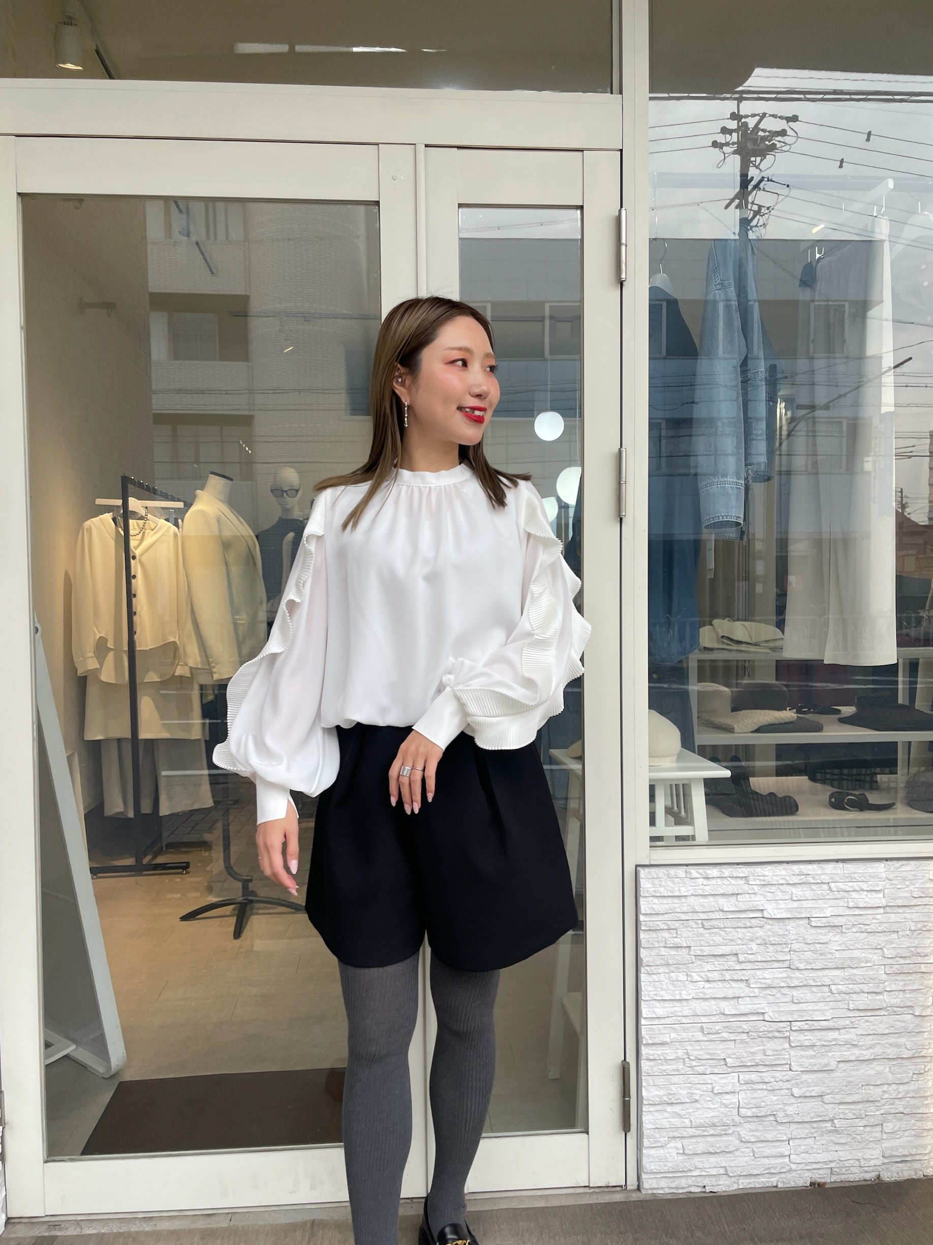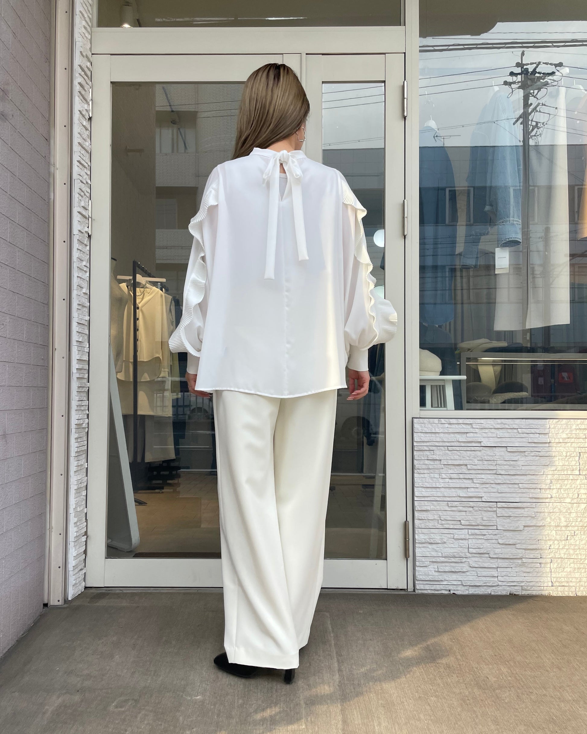 サテンプリーツのフリルとボウタイリボンが、コーデに程よいトレンド感をプラスします。